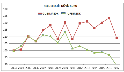Bilindiği üzere, uluslararası rekabet gücünün ölçülerinden birisi olan reel bazlı birim iş gücü maliyetinin değişimini, Merkez Bankası’nın üç ayda bir yayınladığı Birim İş Gücü Maliyeti Bazlı Reel Efektif Döviz Kuru endeksinden takip edebiliyoruz. Merkez Bankası, Türkiye’nin dış ticaretinde önemli paya sahip belli başlı 15 Avrupa ülkesi ve ABD nin dahil olduğu gelişmiş ülkelerin para birimlerinden oluşan sepete göre hesaplanan, Gelişmiş Ülkeler Birim İş Gücü Maliyeti Bazlı Reel Efektif Döviz Kurunu (GUBİMBREDK) üç aylık dönemlerde yayınlamaktadır. Diğer taraftan uluslararası rekabette önemli bir diğer gösterge olan Üfe Bazlı Reel Efektif Döviz Kuru (ÜFEBREDK) da yine Merkez Bankası tarafından, üç aylık dönemlerde yayınlanmaktadır. Bu kurların artması ,diğer bir değişle yukarı yönlü hareket etmesi rekabet gücünü azaltmakta, kurların düşmesi,yani aşağı yönlü hareket etmesi ise rekabet gücünü artırmaktadır. Aşağıdaki grafik Merkez Bankası tarafından yayınlanan bu iki kurun yıllık ortalamalarının 2003 yılı baz alınarak 2017 yılının ikinci çeyreğine kadar gelişimini göstermektedir.