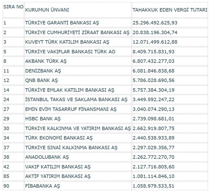 Aşağıdaki listeden görüleceği üzere burada bankacılık sektöründen 18 şirket var ve bu şirketlerce tahakkuk ettirilen toplam vergi tutarı da 114 milyar 208 milyon TL olarak hesaplandı.Bunafinans sektöründe yer alan; “sigorta şirketleri”, “aracı kurumlar”, “portföy yönetim şirketleri”, “finansal kiralama şirketleri” gibi diğer kurumları da eklediğimizde neredeyse kurumlar vergisinin bu kurumlardan toplandığını söyleyebiliriz.