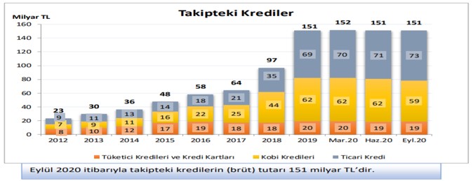 Söz konusu açıklamanın üzerine Türk bankacılık sektörünün vermiş olduğu kredilerin ne kadarının takibe alındığını incelendiğimizde ise 2020 yılı Eylül sonu itibarıyla takipteki kredilerin tutarının 151 milyar TL’ye ulaştığı ve bunun toplam kredi hacminin % 4,25’ine tekabül ettiği görülmektedir. Tahsili geciken ve yakın izlemedeki kredi stokunun % 89’u ise KOBİ, ticari ve kurumsal nitelikli kredilerden oluşmaktadır.