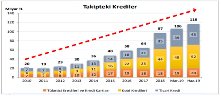 Verilen kredilerin ne kadarının takibe alındığı incelendiğinde ise Haziran 2019 dönemi itibarıyla takipteki kredilerin (brüt) tutarının 116 milyar TL’ye ulaştığı ve bunun toplam kredi hacminin % 4,5’ine tekabül ettiği görülmektedir. Yine aşağıda yer alan grafikten de anlaşılacağı üzere takipteki kredilerin tutarı son 9 senede yaklaşık olarak 6 katına çıkmıştır.