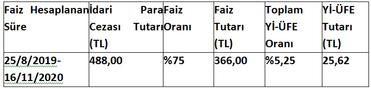 Vergi dairesi yapılandırılan alacak tutarını 488,00 TL idari para cezası aslı ve 25,62 TL Yİ-ÜFE tutarı olmak üzere 513,62 TL olarak hesaplamıştır.