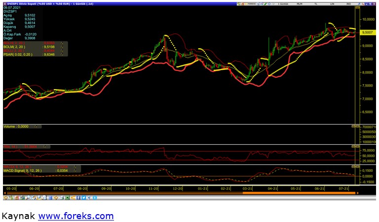 Bu sinyallere göre neler olabileceğini birlikte tahmin edelim; son zamanlarda adeta cetvel gibi bir görüntü veren fiyatlar, 9,46-9,54 bandına iyice sıkışmış durumdadır. Bu arada MACD ve PSAR gibi önemli trend göstergeleri aşağı yönde bir hareket olabileceğini işaret etmektedirler. Sepet bazında 9,41 TL seviyesi son derece önemlidir. Bu seviyelerinde altında olması 9,19 TL seviyelerine kadar bir gevşeme gelebileceği anlamına gelmektedir. Yukarıda kırmızı çizgimiz ise 9,68 TL seviyeleridir.