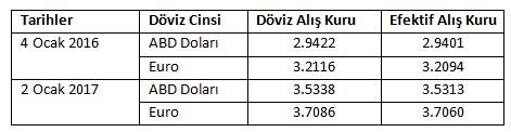 4 Ocak 2016 ve 2 Ocak 2017 Tarihli TCMB ABD Doları ile Euro Döviz Alış ve Efektif Alış Kurları aşağıdaki gibidir.