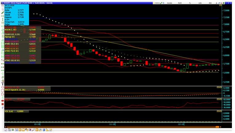 Yukarıdaki grafiğe baktığımızda 7,39 lardan gelen düşüş trendini bitirmeye çalıştığını gözlemliyoruz. Önemli bazı trend göstergeleri yukarı yön sinyalleri vermektedir. Bazı teknik göstergeler de yakın zamanlarda sert yönde hareketlerin olabileceği uyarısı yapmaktadır. 5,85 ve 6,01 seviyelerinde dirençleri bulunan döviz sepetinin yukarı yönde denemeler yapması teknik verilere göre sürpriz sayılmayacaktır.