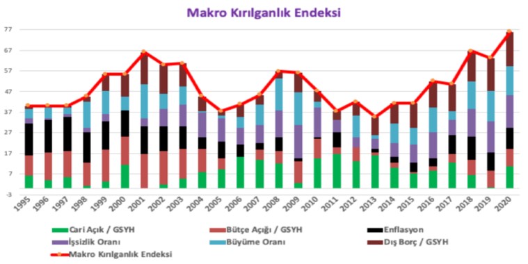 Sayın Hakan Özyıldız tarafından hazırlanan ve büyüme, bütçe açığı, enflasyon, cari açık, dış borç stoku ve işsizlik gibi makro değişkenlerden oluşan makro kırılganlık endeksi, 2001 yılındaki düzeyini dahi geçerek bize yeni bir zirve yapmış olduğu sinyalini vermektedir.