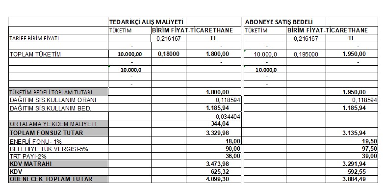 Aşağıda yer alan tabloda bir elektrik firmasının ticarethane tarifesi üzerinden aboneye sattığı elektrik faturası örnek alınarak alış ve satış bilgileri ve nasıl zarar ettiği yer almaktadır.