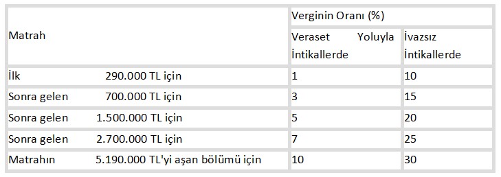 Bir şahsa ana, baba eş ve çocuklarından (evlatlıktan evlat edinenlere yapılan ivazsız intikaller hariç) ivazsız mal intikali halinde vergi, ivazsız intikallere ilişkin tarifede yeralan oranların yarısı uygulanarak hesaplanır. Ana, baba, eş ve çocuklar dışındaki ivazsız intikallerde (örneğin kardeşler arasında) ise tutara göre 10, 15, 20, 25, 30 oranları dikkate alınacaktır. Veraset yoluyla intikallerde ise oranlar daha düşük olup, 1, 3, 5, 7, 10 şeklindedir.