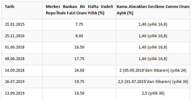 Cumhurbaşkanı’nın 1206 sayılı Kararı ile kamu alacakları için 01.07.2019 tarihinden itibaren uygulanacak gecikme zammı oranı %2,5 olarak belirlendiğinde Merkez Bankasının belirlediği politika faizi olan bir hafta vadeli repo ihale faiz oranı yıllık bazda %24, aylık bazda %2 idi. Aşağıdaki tabloda Merkez Bankasının belirlediği politika faizi olan bir hafta vadeli repo ihale faizi oranı ile kamu alacakları için uygulanan gecikme zammı faizi oranları karşılaştırılmıştır.