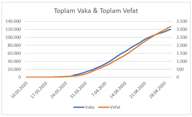 Öncelikle birçok platformda paylaşılan toplam vaka ve toplam vefat sayılarına bir bakalım. Genellikle bu grafikte her iki veri için de aynı ölçeklendirme kullanılıyor. İki verinin aldığı değerler birbirinden çok farklı olduğu için ben öyle yapmadım ve iki veriyi farklı ölçeklendirmeyle aynı grafikte gösterdim. Görmüş olduğunuz gibi toplam vaka sayısı eğrisi uzun süre toplam vefat sayısı eğrisinin üzerinde seyretmiş ve 25 Nisan’dan sonra bu eğrinin altına düşmüş. Kabaca ifade etmek gerekirse toplam vaka sayısındaki artış hızı bu tarihten sonra toplam vefat sayısındaki artış hızının altına düşmüş. Korona virüse yakalanan bir hastanın belirli bir tedavi süresi sonunda iyileştiği veya vefat ettiği düşünülürse iyileşen hasta sayısı ile vefat sayısının gecikmeli veriler olduğunu söyleyebiliriz. Bu durumda toplam vaka sayısındaki artış hızı yavaşlamaya başlamışsa bir süre sonra toplam vefat sayısındaki artış hızı da yavaşlayacaktır. BU BİRİNCİ İYİ HABER!