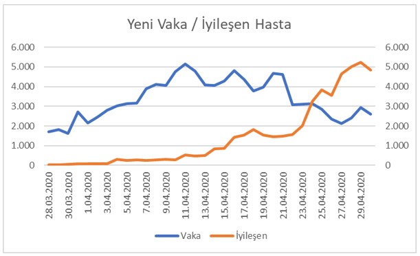 Şimdi bir de yeni vaka sayısı ile iyileşen hasta sayısını karşılaştıralım. Gördüğünüz gibi yeni vaka sayısı 11 Nisan’da zirve yaptıktan sonra düşüşe geçmeye başlamış. İyileşen hasta sayısı ise özellikle 15 Nisan’dan itibaren hızla yükselmiş ve 24 Nisan’da yeni vaka sayısını yakalayıp geçmiş. Bu şu demek: 24 Nisan öncesinde iyileşen hasta sayısı yeni gelen hasta sayısından az olduğu için Korona virüsle mücadele etmekte olan hasta sayımız durmadan artıyordu. 24 Nisan’dan sonra ise iyileşen hasta sayımızdan daha az yeni hasta geldiği için Korona virüsle mücadele etmekte olan hasta sayımız giderek azalıyor. BU İKİNCİ İYİ HABER!