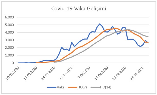 Şimdi biraz da teknik analiz yapalım. Yukarıdaki grafikte günlük vaka sayısının seyri görülüyor. Günlük vaka sayılarını 7 günlük hareketli ortalama ve virüsün kuluçka süresi olarak açıklanan 14 günlük hareketli ortalama ile karşılaştıralım. Teknik analiz yapanlar bilir, zaman serisi hareketli ortalamaların üzerindeyse yukarı yönlü bir trendden bahsedilir. Grafikten de görüleceği üzere günlük vaka sayısı 16 Nisan’da 7 günlük hareketli ortalamaya eşitlenmiş. 7 günlük kısa vadeli hareketli ortalama ise 22 Nisan’dan sonra 14 günlük uzun vadeli hareketli ortalamanın altına düşmüş. Diğer bir ifadeyle 22 Nisan’dan sonra aşağı yönlü bir trend başlamış. Her ne kadar grafikte 27 ve 28 Nisan’da vaka sayısı yükselmiş gibi görünse de bu yapılan test sayısıyla ilgili bir durum, sizi yanıltmasın. BU ÜÇÜNCÜ İYİ HABER!