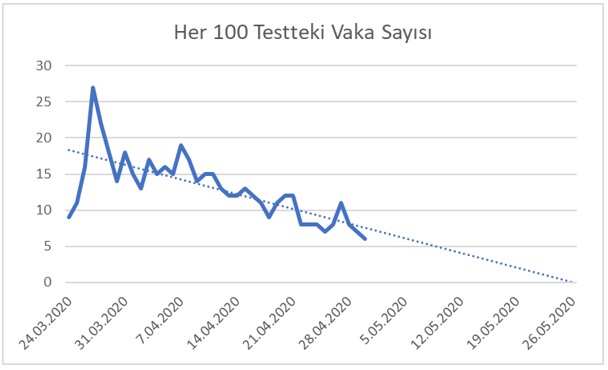 Sağlık Bakanlığı tarafından günlük olarak açıklanan verilerde test sayıları değişkenlik gösterdiği için yeni vaka sayısı yapılan test sayısına bağımlı bir veri. Bu nedenle sadece günlük vaka sayılarını analiz etmek biraz önce de söylediğim gibi yanıltıcı olabilir. Seriyi daha anlamlı bir hale getirmek için her 100 test başına tespit edilen vaka sayını hesaplayabiliriz. Yukarıdaki son grafik bu düzeltilmiş veriyi gösteriyor. Görüldüğü üzere 27 Mart’tan bu yana yapılan her 100 testte tespit edilen vaka sayısında istikrarlı bir azalma var. BU DÖRDÜNCÜ İYİ HABER!