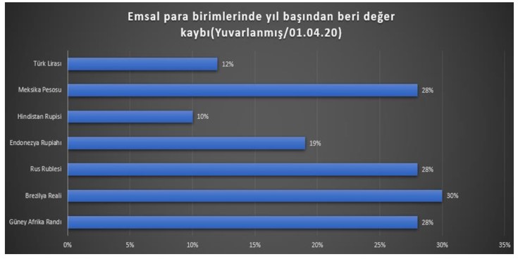 Aşağıda yer alan tabloda Türkiye gibi birçok gelişmekte olan ülke para birimlerinin dünya parası olan Amerikan Doları karşısında yılın başından bu yana gerçekleşen değer kaybına yer verilmiştir. Amerika’nın, FED aracılığı ile piyasaya trilyonlarca dolar likidite vereceğini ilan etmesine ve arzı artan doların değerinin düşmesi beklenmesine rağmen, daha önce eşi benzeri görülmemiş bu pandemi zamanında sermaye hala güvenli liman olarak doları tercih etmiş, diğer tüm para birimleri karsısında değerini artırmıştır.