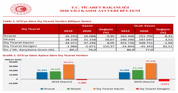 İlk olarak dış ticaret verilerini incelediğimizde, Türkiye’nin 2020 yılının ilk 11 aylık dış ticaret açığı,yavaşlayan ekonomik aktivitelere rağmen -46 milyar USD olarak gerçekleşmiş görünüyor.Turizm gelirlerinin de pandemi sebebiyle ciddi anlamda azalmasına bağlı olarak cari açığın ise yıl sonunda 30 milyar doların biraz üzerinde olacak şekilde gerçekleşmesi bekleniyor.
