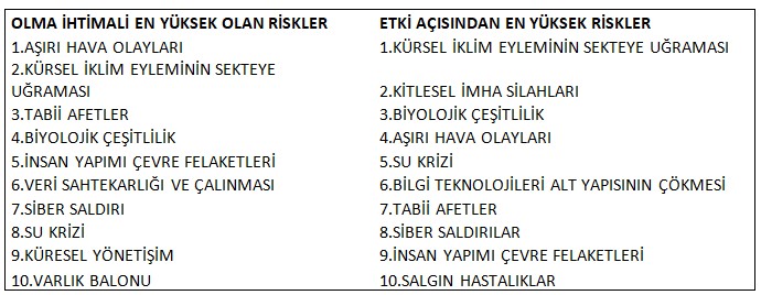 Davos’ta 21-24 Ocak 2020 tarihin de yapılan Dünya Ekonomik Formu toplantısında Dünya Ekonomik Formu tarafından hazırlanan ve sunulan 2020 Yılı Global Risk Raporunda, Ekonomik, Çevresel, Jeopolitik, Toplumsal ve Teknolojik açıdan oluşabilecek en yüksek 10 risk sıralanmıştır. Marsh &McLennan and Zurich Insurance Group tarafından yapılan araştırma sonuçlarına göre 2020 yılında yukarıda belirttiğim 5 katagoride belirlenen en yüksek 10 riskin olma ihtimali ve etki açısından sıralanması aşağıdaki gibidir.