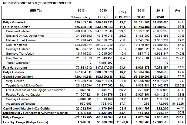 2019 yılının daha ilk ayı olan Ocak ayında 12.3 milyar TL Faiz Dışı Fazla gerçekleşmiş olmasına rağmen bu fazlalığın ana kaynağı bir defaya mahsus olan Teşebbüs ve Mülkiyet Gelirleri içinde yer alan 35 milyar TL tutarındaki gelirdir. Bu gelirin kaynağı ise Merkez Bankasının 2018 yılında elde etiği karın temettü olarak Hazine'ye aktarılmasıdır.