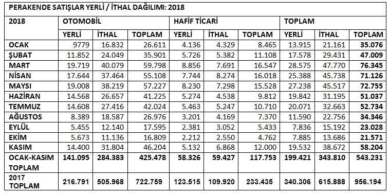 Aşağıdaki tabloda 2018 yılı satış rakamları yer almaktadır. Söz konusu rakamlar Otomotiv Distribütörleri Derneği’nin sayfasından alınmıştır.
