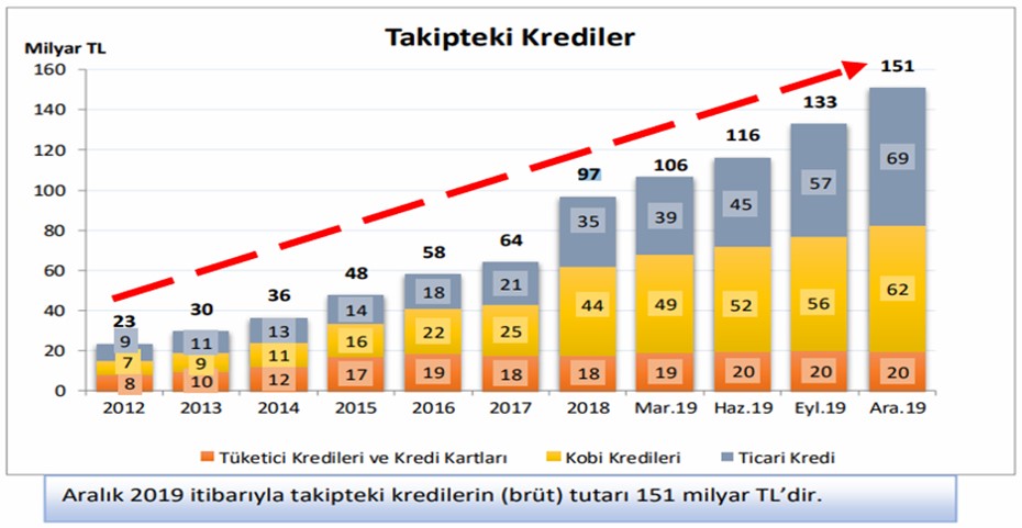 Türk bankacılık sektörünün vermiş olduğu kredilerin ne kadarının takibe alındığı incelendiğinde ise 2019 yıl sonu itibarıyla takipteki kredilerin (brüt) tutarının 151 milyar TL’ye ulaştığı ve bunun toplam kredi hacminin % 5,7’sine tekabül ettiği görülmektedir. Yine aşağıda yer alan grafikten de anlaşılacağı üzere takipteki kredilerin tutarı 2018 yılına nazaran % 55 oranında artış göstermiştir.